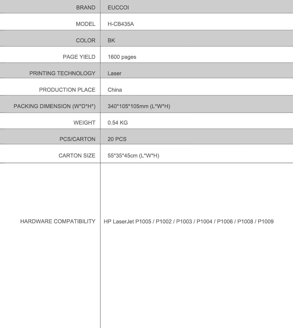 Model: EUCCOI CB435A toner cartridge